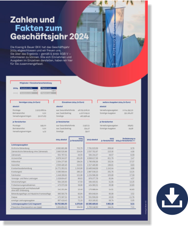 Zahlen, Daten, Fakten - Geschäftsjahr 2024 Übersicht der Daten, Zahlen und Fakten zum Geschäftsjahr 2024 der Koenig & Bauer BKK. Wie sich Einnahmen und Ausgaben im Einzelnen darstellenhaben wir für Sie zusammengefasst