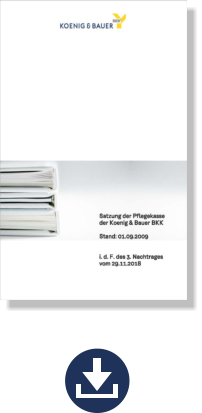 Die Satzung der Koenig & Bauer BKK In der Satzung der Koenig & Bauer BKK finden Sie Regelungen zur Mitgliedschaft, zu den Leistungen/einschließlich Mehrleistungen und zu den Beiträgen. Über Änderungen der Satzung entscheidet der Verwaltungsrat der Koenig & Bauer BKK. Die Satzung der Pflegekasse der Koenig & Bauer BKK Die neusten Versionen kommen zeitnah
